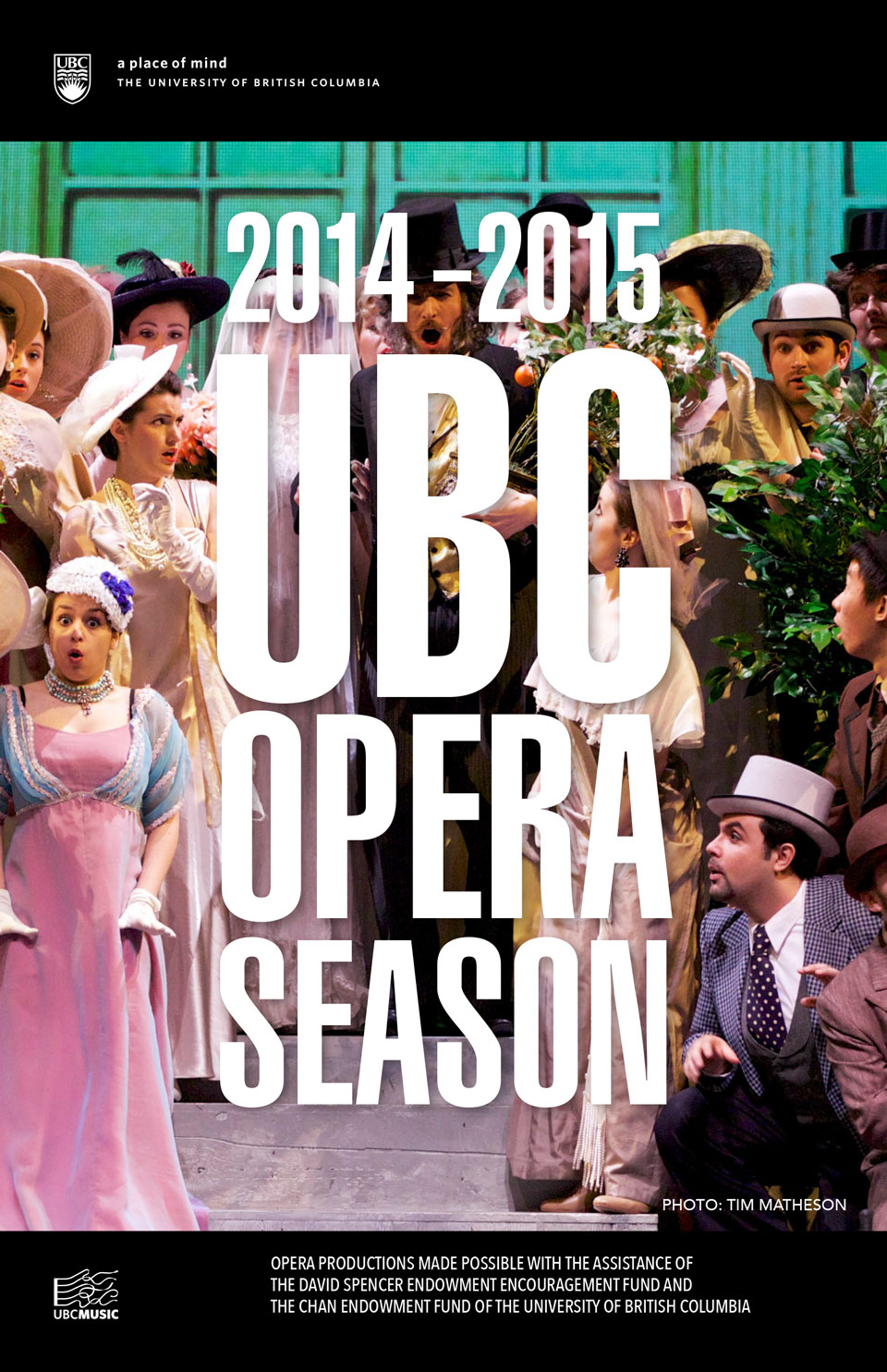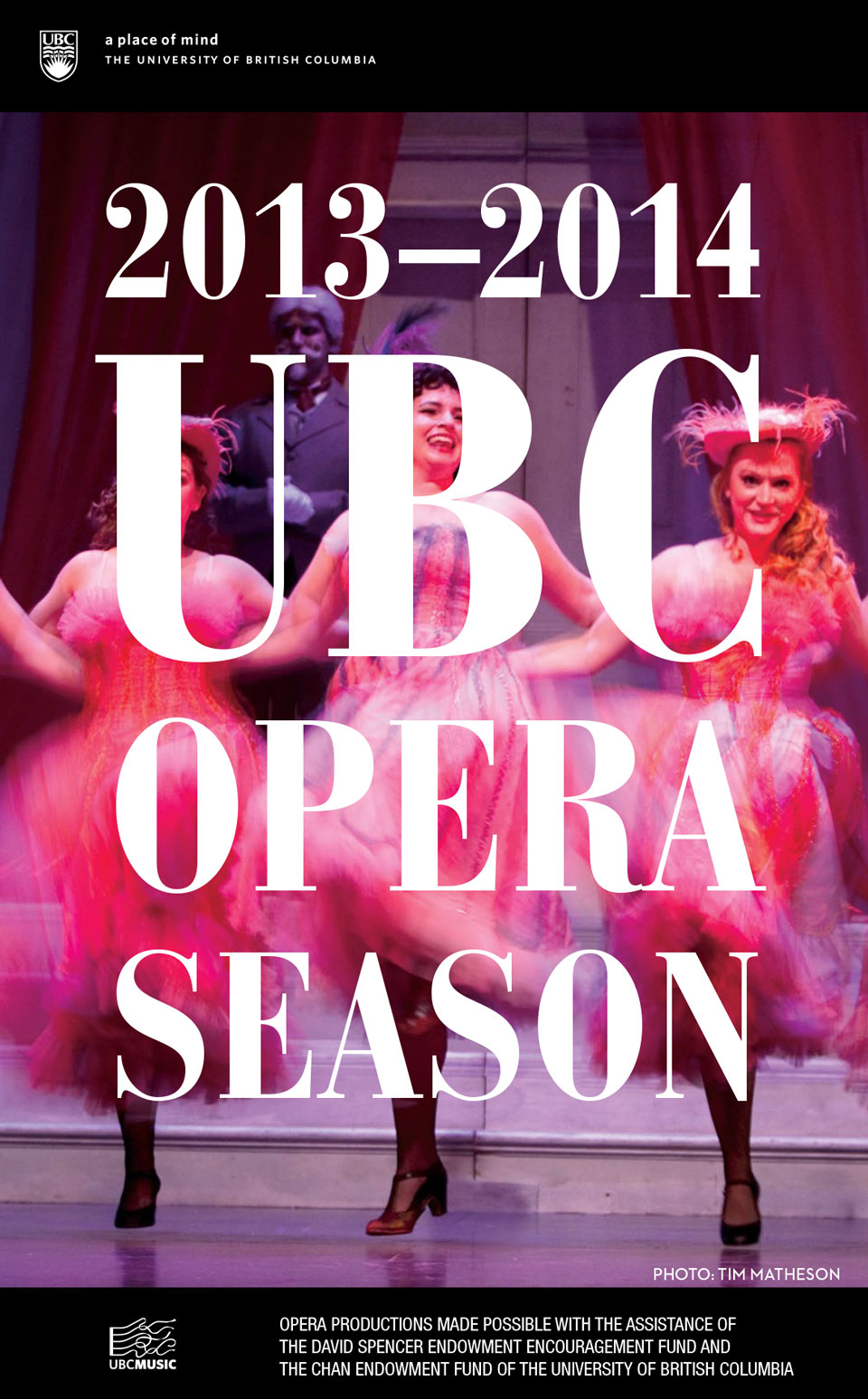 The University of British Columbia’s Opera Ensemble trains talented young singers from all over the world, preparing them to seek professional careers in opera performance. Beginning in 2013 I have been designing and producing all advertising and print/web elements for the Ensemble’s three mainstage operas and seasonal concerts. I continue to work with the university programme.